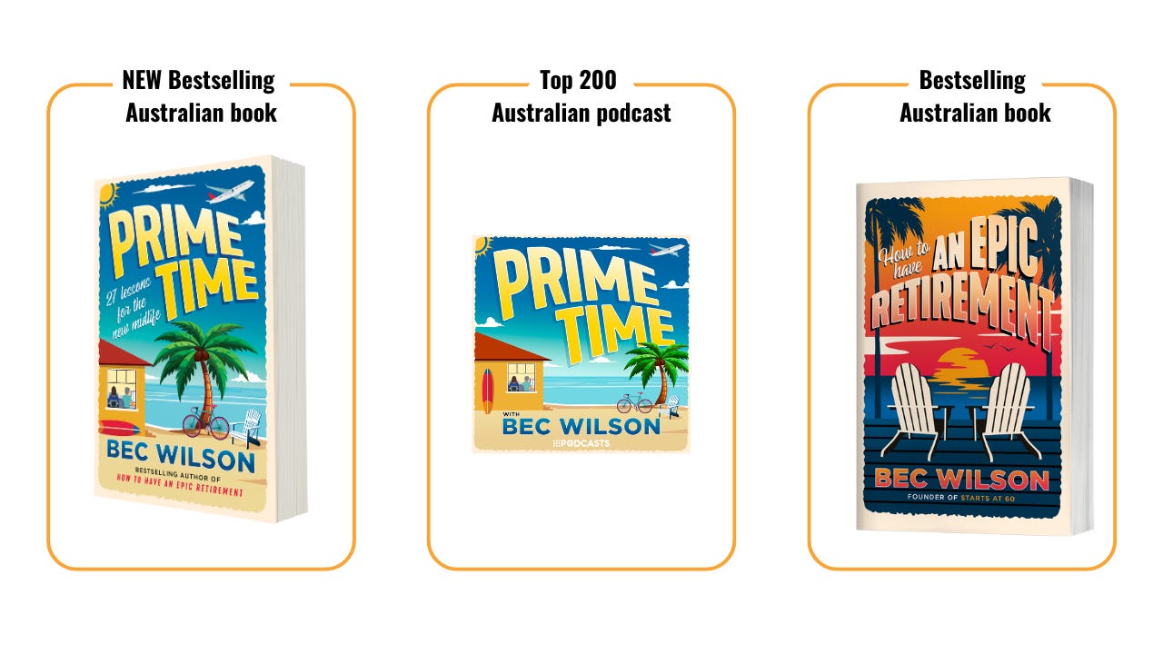 Alongside that, Prime Time — my newest book in Australia — has already become a bestseller back home. While it was written for Australians who needed it right now, the ideas at its heart are universal and they drop in perfectly AFTER Epic Retirement has launched. Because the truth is, people in the UK, USA, Canada, and New Zealand are asking the same big questions: how do we make these years in midlife, before we retire better? How do we live in a way that retirement is no longer the ultimate goal - ‘choice’ is. How do we create a retirement plan and budget earlier; and then map out a pre-retirement life stage we can get excited about?
