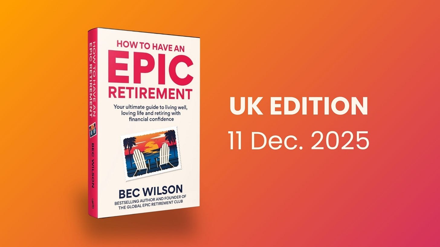 In case you missed it, we announced the cover of the UK edition of How to Have an Epic Retirement last weekend. It’s a hardcover non-fiction book, completely rewritten for the UK, with extraordinary detail of the State Pension, Workplace and Private pensions, and building out your UK lifestyle. And the cover is very different and very British I’m told!