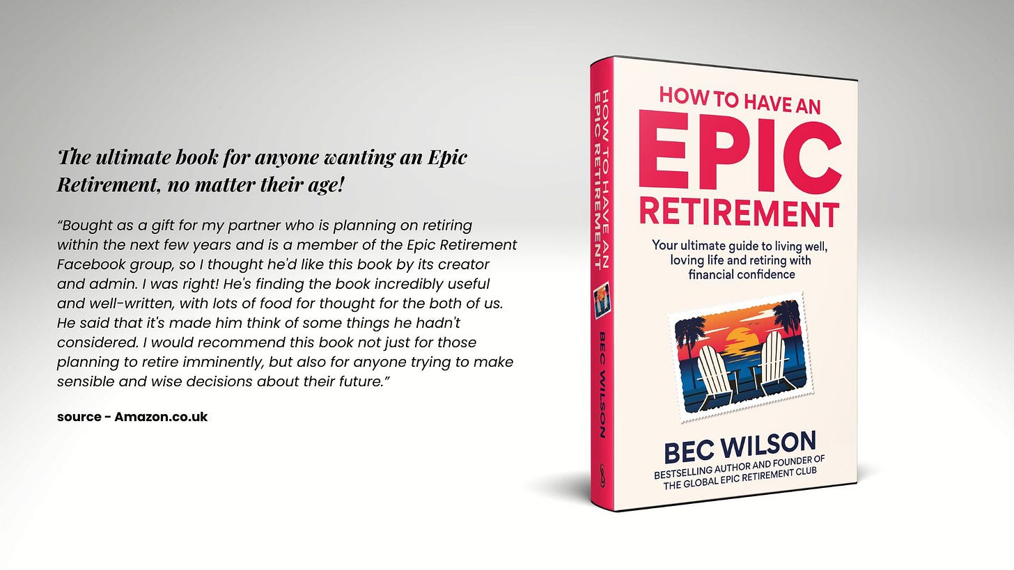 Get your copy of the new UK Bestselling pre-retirement guidebook, How to Have an Epic Retirement: Your ultimate guide to living well, loving life and retiring with financial confidence.